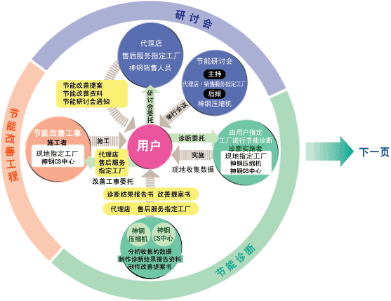 節(jié)能診斷的實(shí)施弊公司以「節(jié)能研討會(huì)」為開始,為了對用戶工廠的「節(jié)能診斷」、改善工廠的提議」等對節(jié)能對策起作用,代理店和售后服務(wù)指定工廠一體化體制。