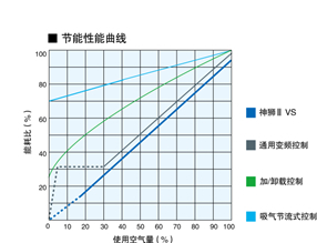 神獅變頻控制可以根據(jù)所需空氣量調(diào)整轉(zhuǎn)數(shù)。與不能進行轉(zhuǎn)數(shù)控制的非變頻機相比,負載率越低,節(jié)能效果越明顯。