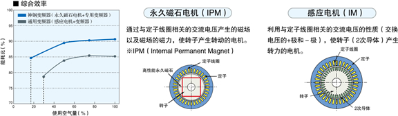 與其他公司裝備的感應(yīng)電機相比,神獅Ⅱ采用了具有巨大節(jié)能效率的、性能優(yōu)越的永久磁石(IPM)電機,并且和專用的變頻器一起使用,發(fā)揮出通用感應(yīng)電機無法比擬的節(jié)能效果。 電機和本體采用內(nèi)嵌式懸垂直連結(jié)構(gòu),削減了各種能耗,實現(xiàn)高效化。