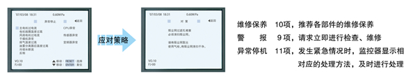 通過液晶電子監(jiān)控器可以隨時了解空壓機的各種運行情況,并且還可以顯示維修、警報、異常停機等畫面。 對應(yīng)各種狀況的處理方法也可以通過液晶電子監(jiān)控器顯示,從而可以及時地應(yīng)付突發(fā)事件。