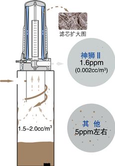 神獅Ⅱ-VS系列在吸氣側(cè)采用了隔塵網(wǎng)和吸氣過濾器兩階段的處理,吸入潔凈的空氣,抑制潤滑油的裂化。 并且通過離心分離、重力分離、過濾分離三階段的油份處理,使排氣中的殘油控制在世界最高水平,達1.6ppm以下。