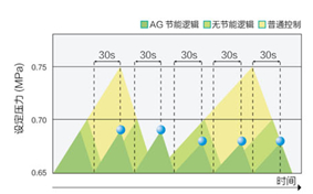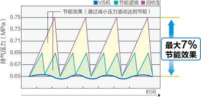 標(biāo)準(zhǔn)配置了當(dāng)加載運(yùn)行超過容量調(diào)整周期(30S)時(shí)可以進(jìn)行強(qiáng)制卸載的節(jié)能邏輯功能。在壓力調(diào)整幅度減少的基礎(chǔ)上,利用較小的壓力切換至卸載運(yùn)行,抑制由于無謂的升壓造成的能耗。